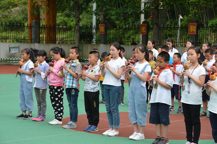 当天的最后一站是大均小学,一进学校们,老师们便被孩子们和全体老师的葫芦丝齐奏紧紧吸引,一曲《月光下的凤尾竹》娓娓入耳,悄悄把老师们带入了校园里的葫芦文化。该学校以葫芦为特色,本着吹响葫芦丝、做强葫芦娃、做美葫芦梦的宗旨办出了丰富多彩的乡村小学校。