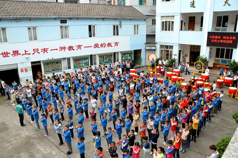 5月4日,在长坑小学和当地教育局的支持下,老师们来到丽水景宁畲族自治县,分别参观走访了当地三所“小而美”的乡村学校。东坑小学,一所充满了畲族文化的乡村“三味”小学校,所谓“三味”是景宁县当地所倡导特色乡村教育,分别为乡土味、小班味、家园味。东坑小学秉着“花样教育,做最美的自己”的教学理念育人育心,学校不仅在校园文化建设结合了畲族的特点,同时也在大课间活动融入了有趣的畲族色彩。